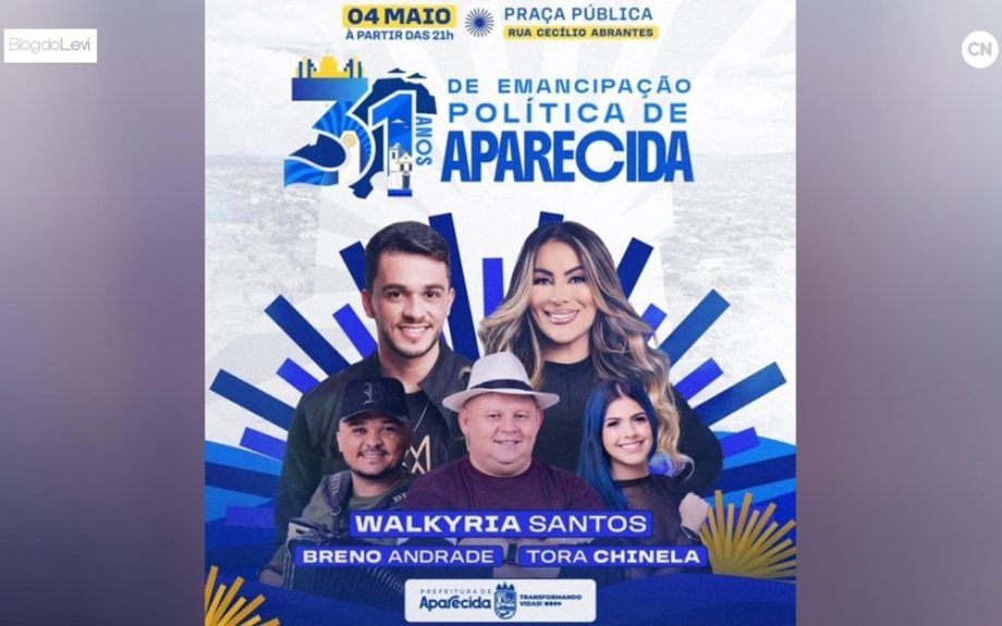 O prefeito João Neto (PSB) falou nesta quinta-feira (24) sobre a programação de obras (incluindo a construção de 100 casas), serviços e shows em praça pública entre os dias 30 de abril e 05 de maio deste ano em comemoração aos 31 anos de emancipação política do município de Aparecida, Sertão da Paraíba. As principais atrações musicais contratadas pela Prefeitura são Walkyria Santos, Breno Andrade e Tora Chinela, além de shows religiosos (4º Despertai para Cristo e 4º Aparecida Fé).