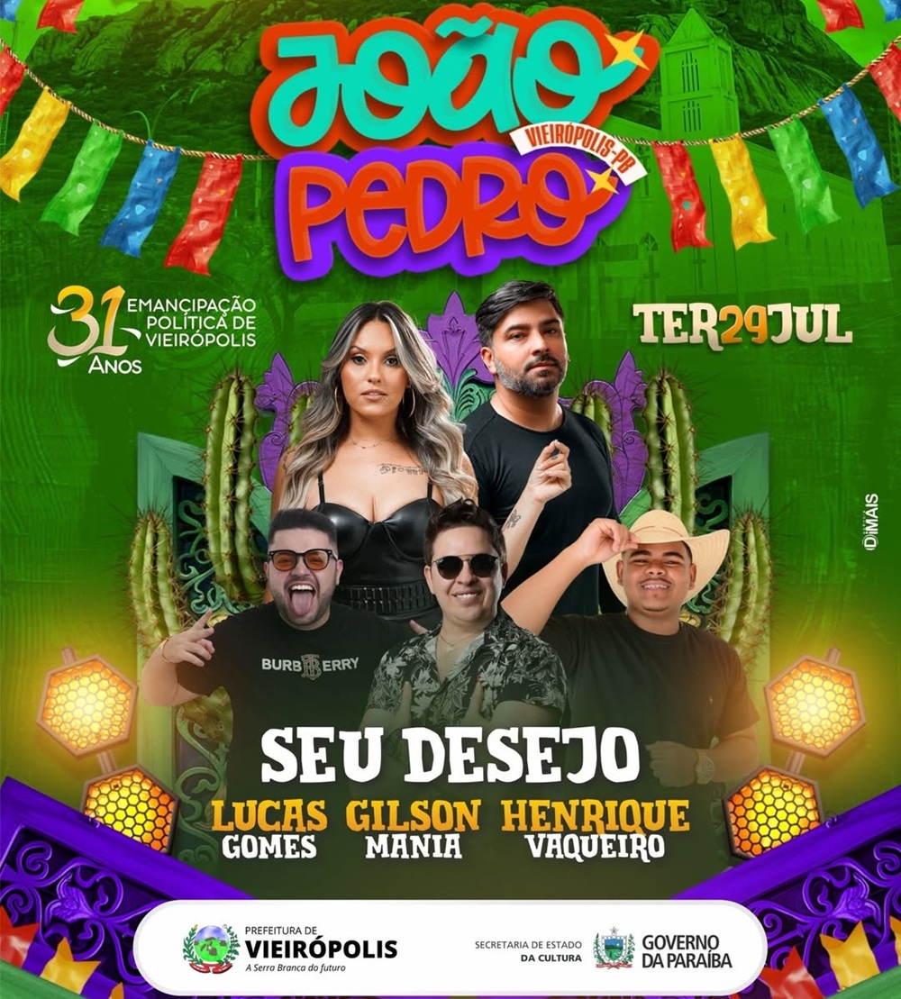 Em relação a parte festiva das comemorações, a Prefeitura de Vieirópolis contratou as seguintes atrações para o dia 29: Henrique Vaqueiro, Lucas Gomes, Gilson Mania e Seu Desejo. Já para o dia 28 (segunda-feira), serão realizados shows religiosos com Harpa de Davi, Harmonia Celeste e Ministério de Música Sagrada Família.