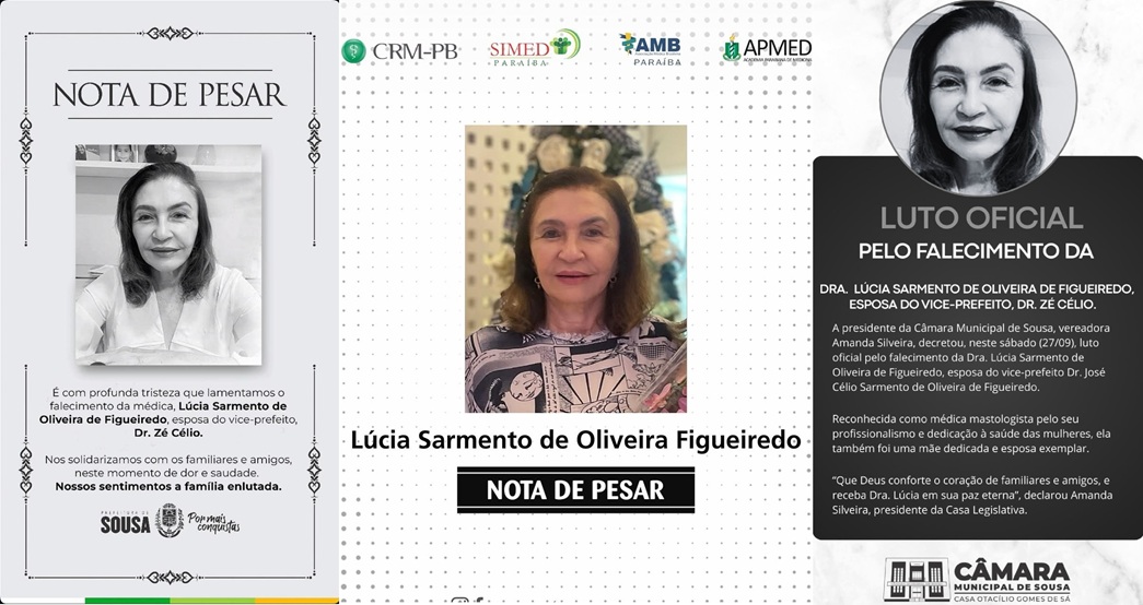 A Câmara de Vereadores de Sousa também decretou luto oficial, reconhecendo a médica pelo seu profissionalismo e compromisso com a saúde das mulheres, reforçando que ela deixa um legado de cuidado, solidariedade e compromisso com a vida.